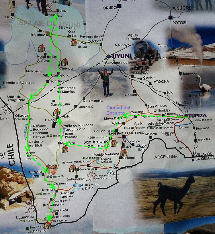 Et si nous parlions de notre itinéraire ? Tout d’abord, nous n’avons pas suivi le trajet « classique » qui part de Tupiza pour finir à Uyuni. Avec une carte, c’est plus facile pour se repérer…